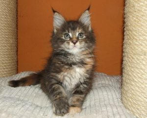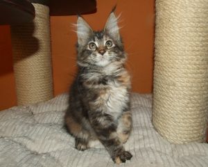 Alfa est une femelle tricolore, elle a des yeux brillants et très expressifs. Elle a un excellent museau et des grands oreilles bien placés avec les “lynx tips” (des poils plus longs qui se trouvent sur les extrémités des oreilles de certains chats à poil mi-long). Alfa a un corps long, bien musclé avec une poitrine large.