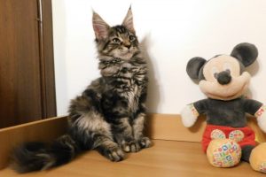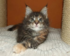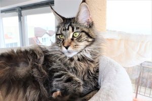 Ares aime les câlins, il est très actif et spontané. Il est très attaché à nous. Il s’occupe de ses chatons aussi bien que leur maman coon.